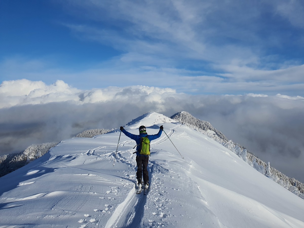 Štart mimo kmetije Jurež, naprej po senožetih proti vrhu. Snega je bilo proti vrhu vedno več, čeprav zaradi precej toplega vremena ni bil čisto pravi pršič. Vreme se je popravilo in na vrhu nas je pričakalo celo sonce.