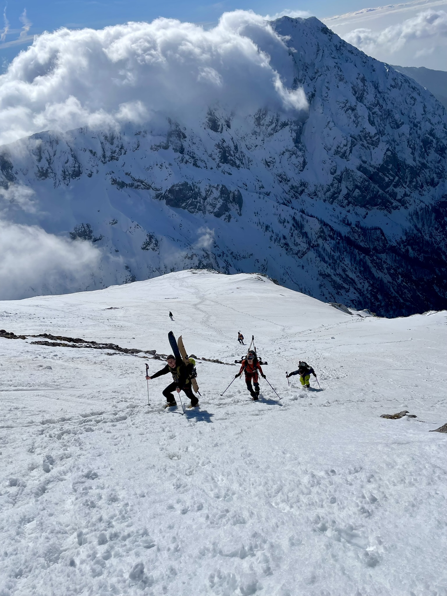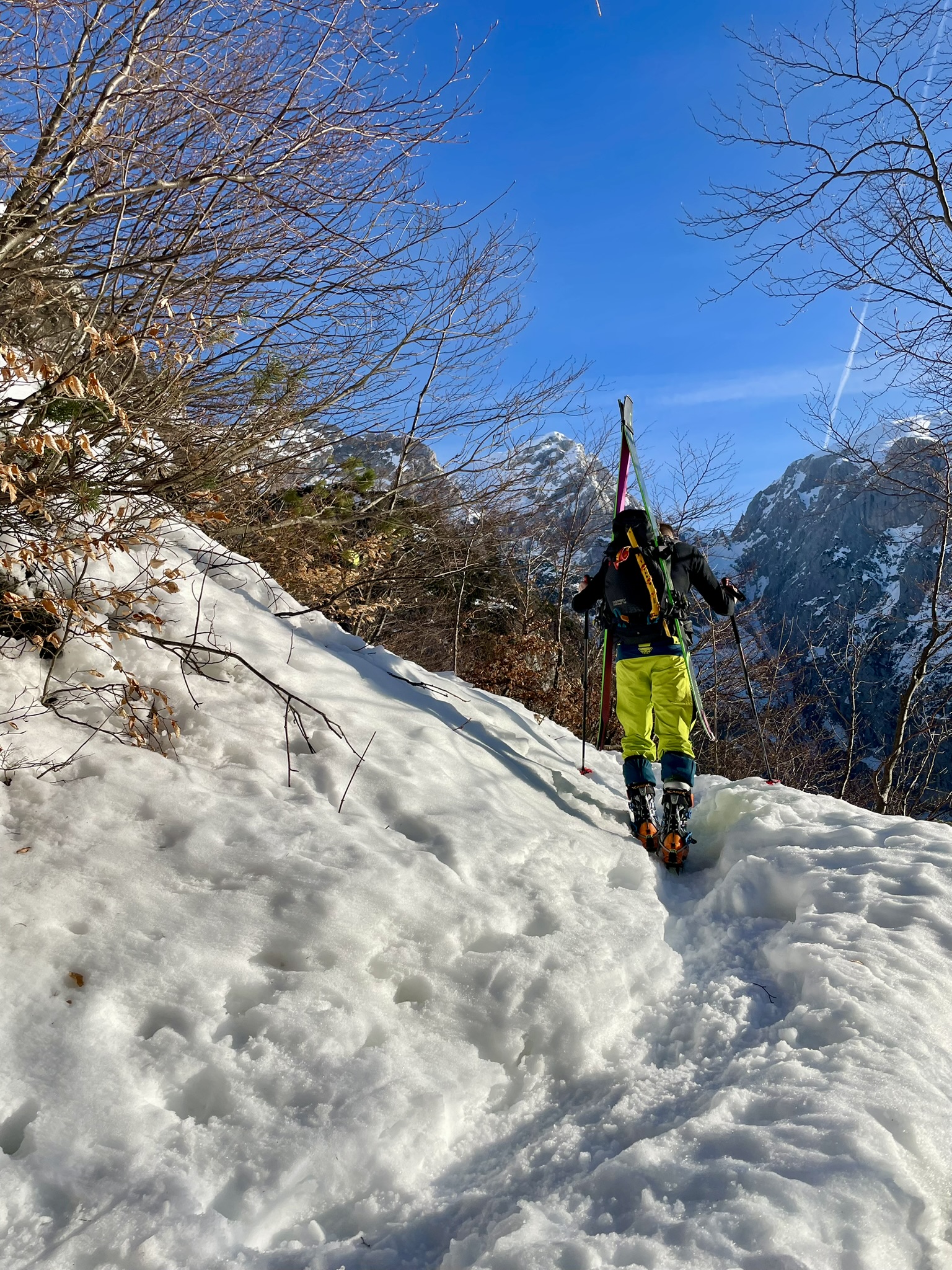 Smuče nosimo nekje do klopce, kjer pustimo čevlje. V spodnjem delu gnoj nato pa od koče naprej predelan spomladanski sneg. Vrh strehe rahlo poledenen zaradi hladnega vetra in temperatur okoli ničle. Super smučanje.