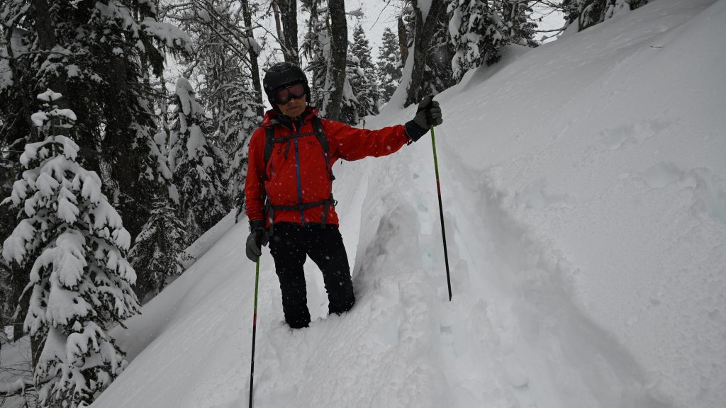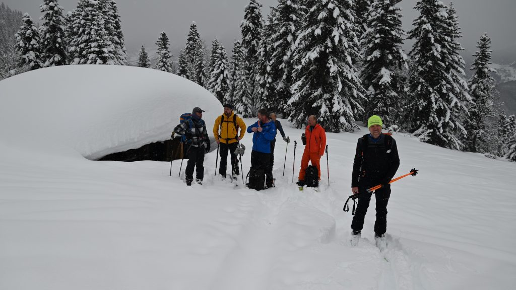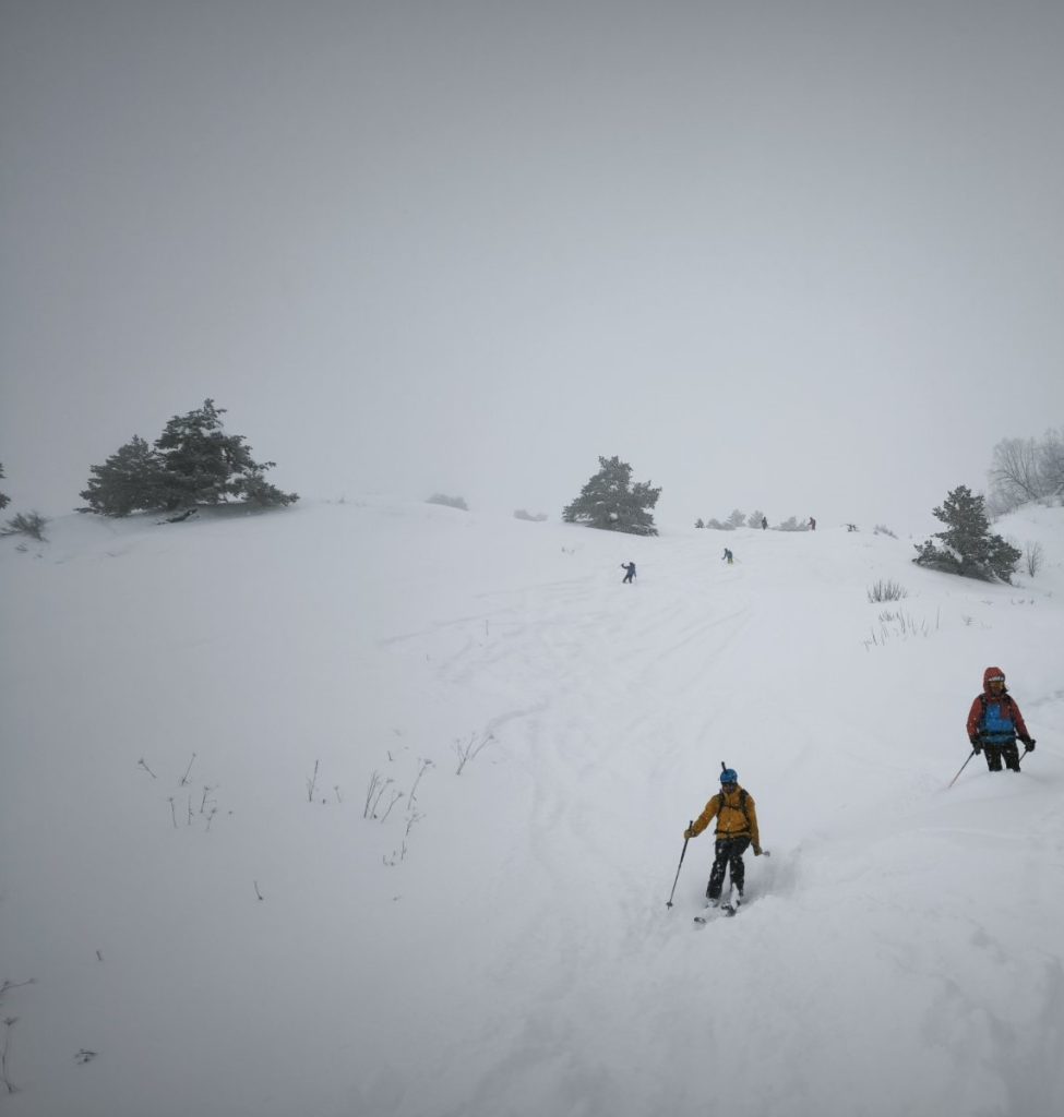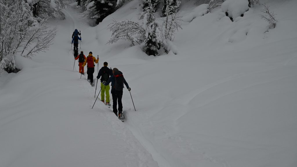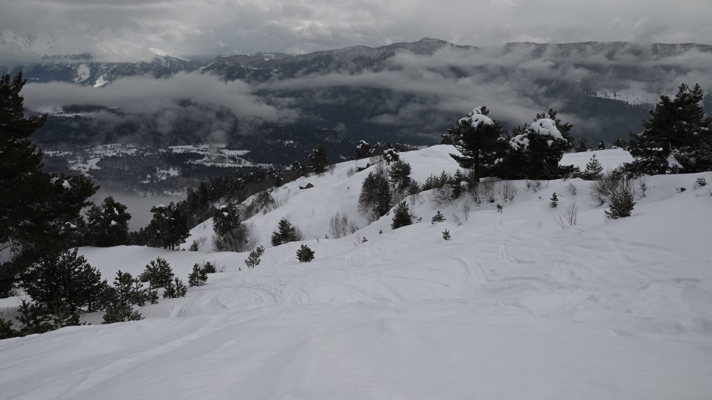 Izpostavljenim legam smo se izogibali. Gozdna meja je med 1800 in 2400 m. Smučati v velikih količinah novega snega nam ni več na razpolago ravno pogosto, zato smo se ga zelo razveselili. Žal pa takšne razmere pogosto spremlja slaba vidljivost z difuzno svetlobo.
