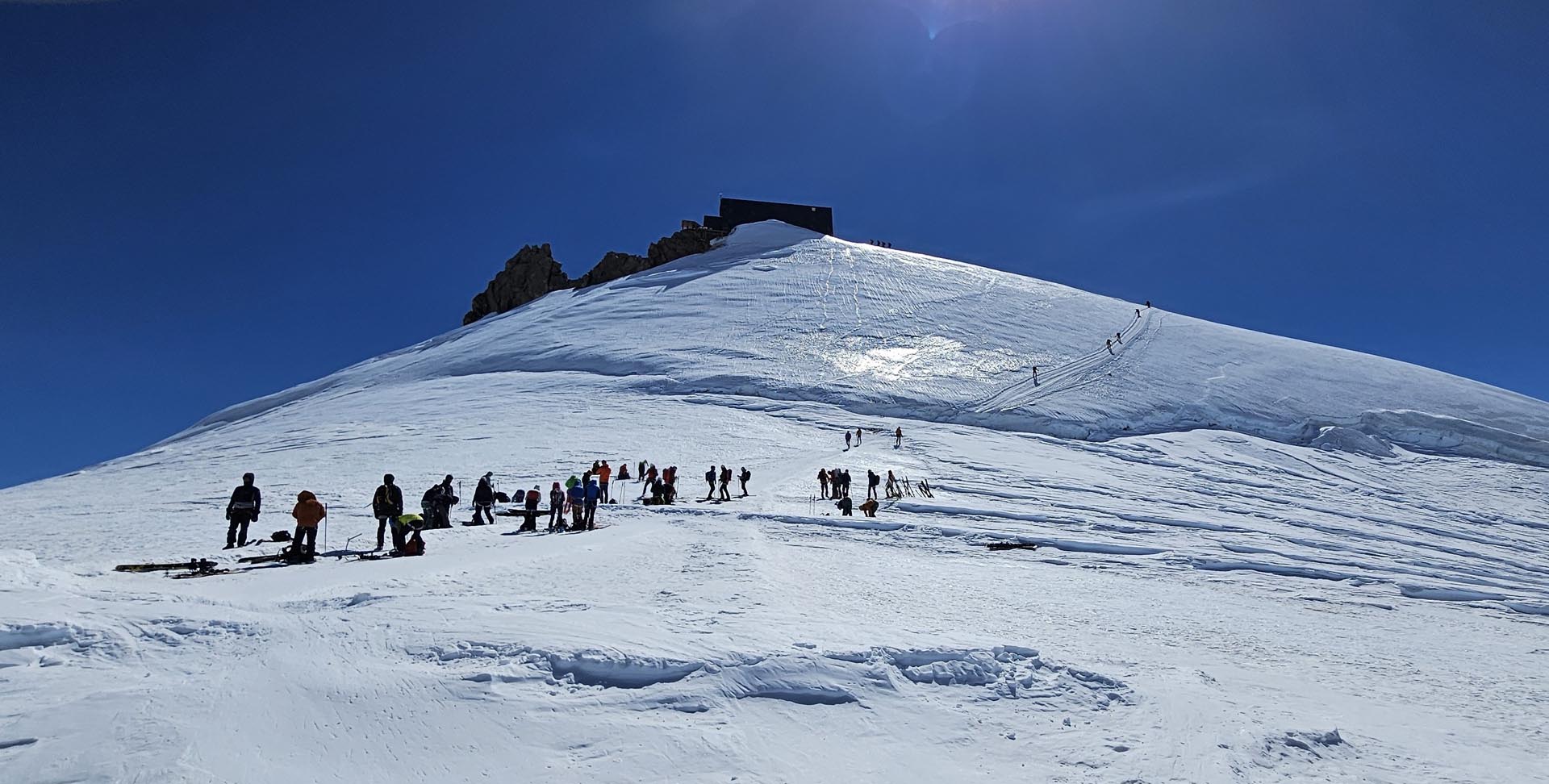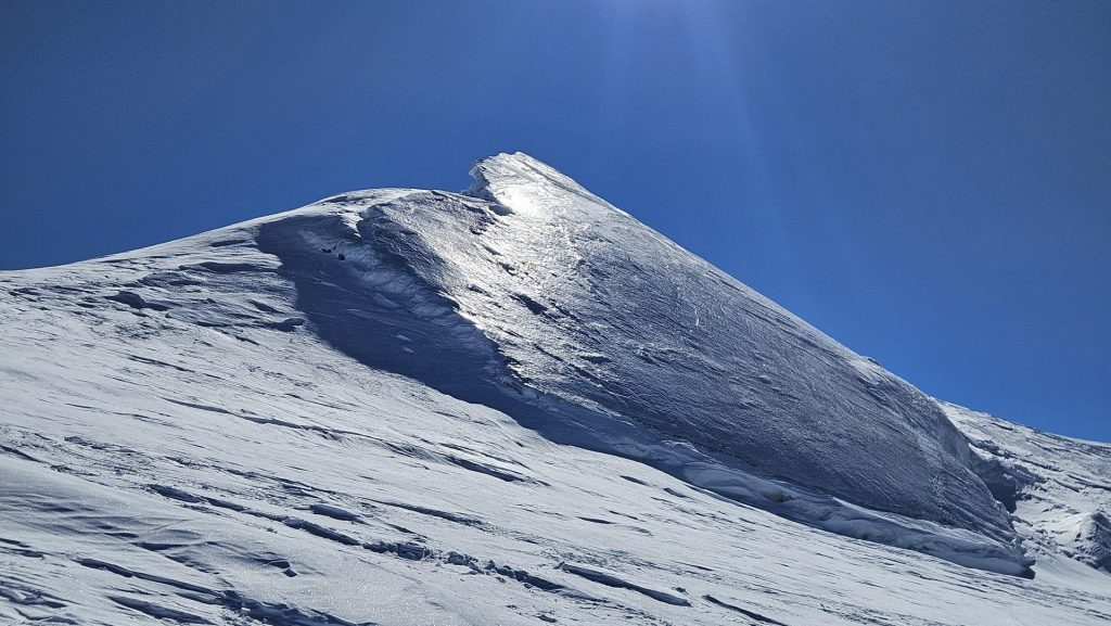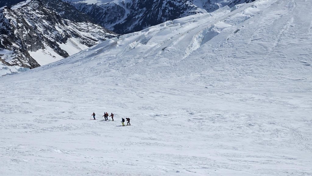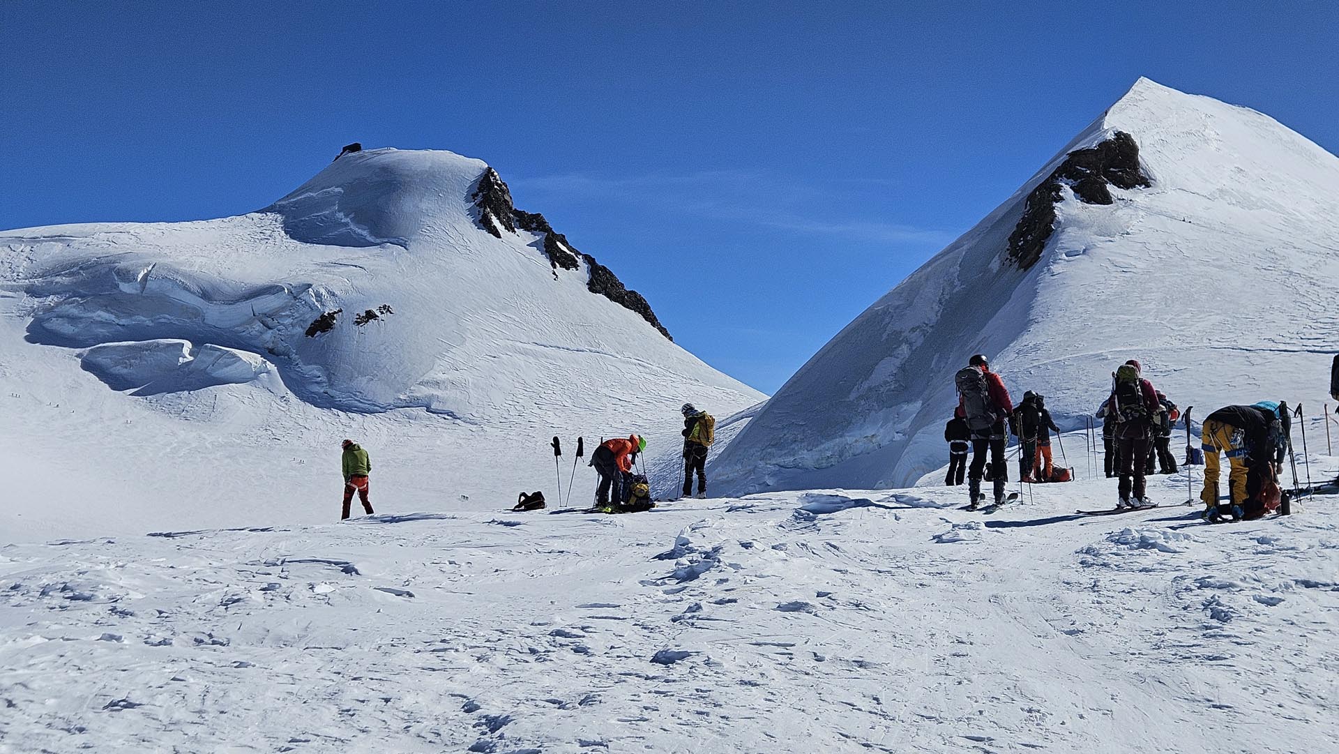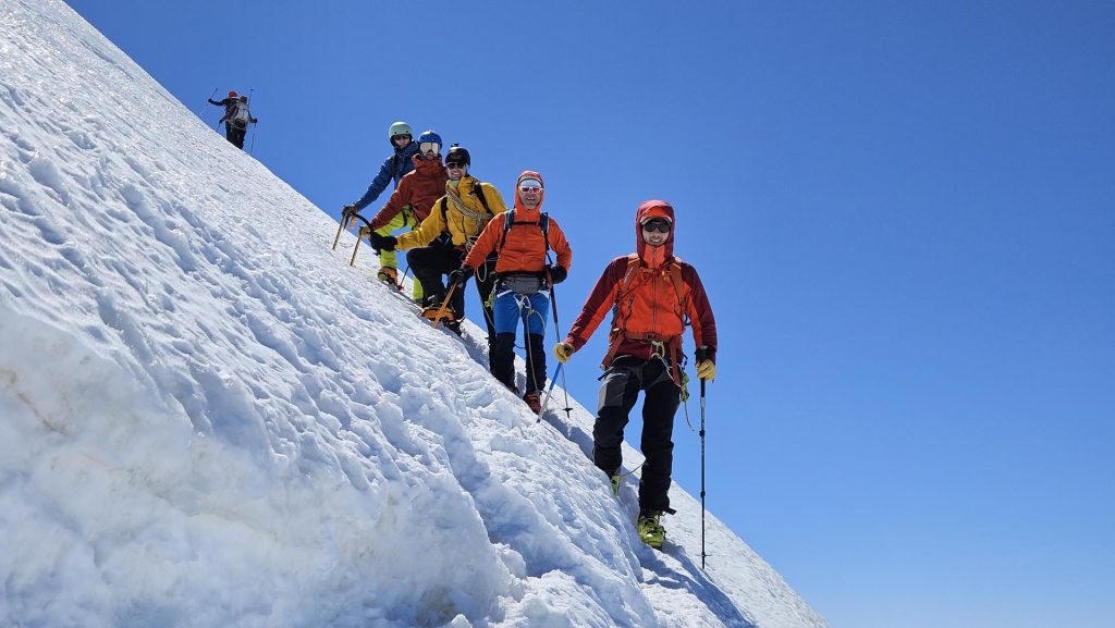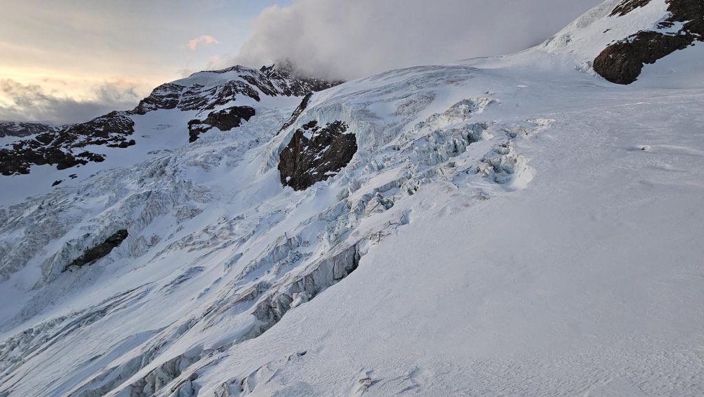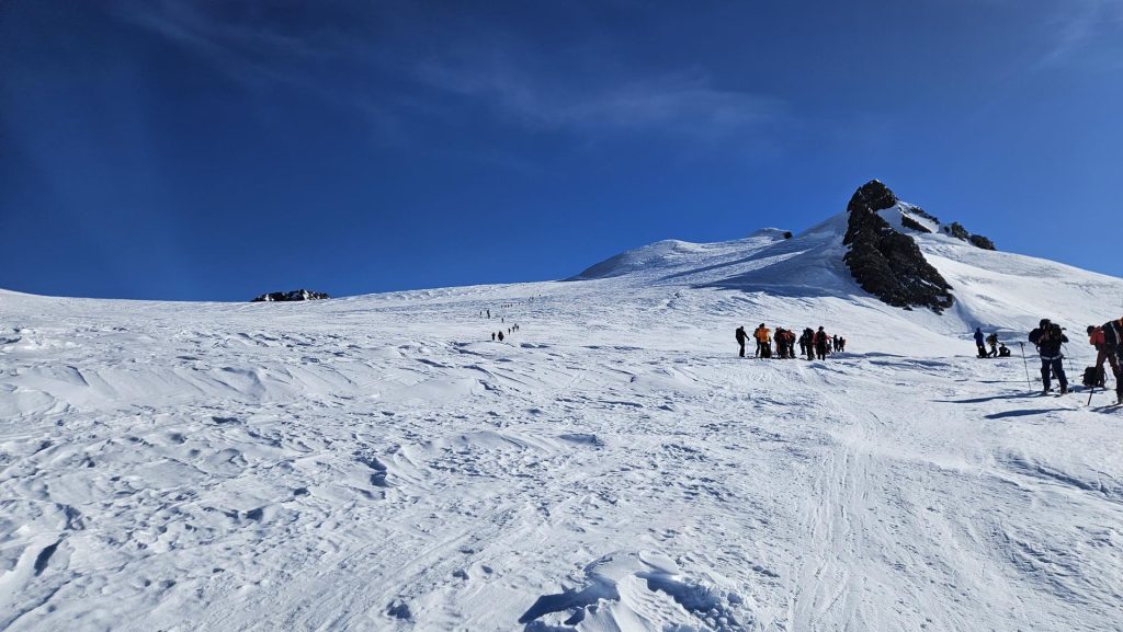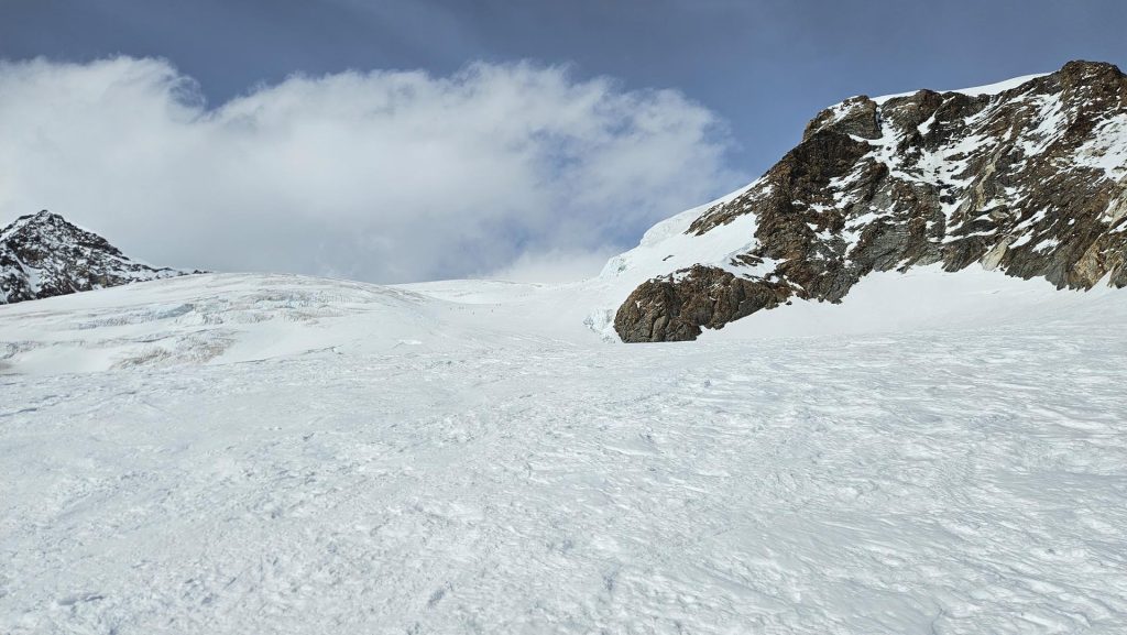 Kmalu po osmi uri smo s počasnimi koraki krenili v ležerno naklonino ledenika nad kočo. Ko se je telo ogrelo in je kri zaokrožila po celem telesu, je pri večini glavobol popustil. Snežna podlaga je bila trda, na nekaterih spihanih mestih pa tudi poledenela, zato je bila uporaba srenačev nujna.