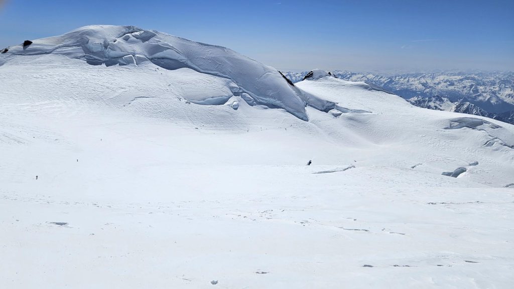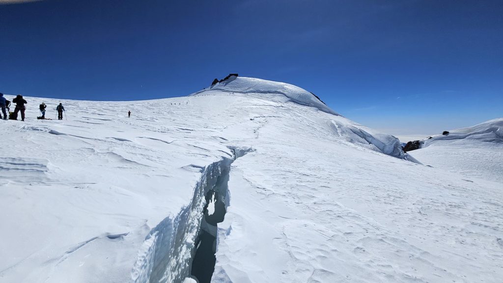 Da se ledeniki v Alpah naglo spreminjajo smo imeli možnost opaziti tudi mi, saj je bilo poleg velikega števila manjših napok na ledeniku tudi več zelo velikih »špalten«. Po pripovedovanju poznavalcev tega v tem letnem času še pred nekaj leti niti približno ni bilo moč opaziti. Ko sem bil sam pred več kot štirimi desetletji meseca septembra na švicarski strani na glavnem vrhu masiva Monte Rose, Duforspitze, pa se zgornjih dva tisoč metrov sploh ne spomnim kakšne ledeniške razpoke.