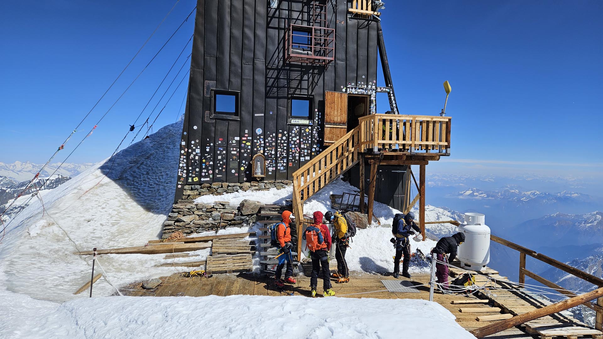 Na hrib smo se z gondolo (40 €) zapeljali iz Staffala (1820 m), saj je edino tam še zasnežena smučarska proga do doline. Gondola od Passo dei Salati (2980 m) do kote Indren (3275 m) je ta vikend še vozila. Pot do koče Gnifetti (3647 m) je bila kljub manjšemu vmesnemu spustu zato bolj ogrevanje oz. opoldanski sprehod. Koča je bila v sedanji obliki rekonstruirana l. 1967, kar pomeni, da ni ravno najmodernejša in je kar prostorna (176 postelj). Ni bila povsem zasedena, a je bila gneča, vsaj prvo noč kar precejšnja. Spali smo v sobah, ki so teoretično za 6 oseb (troetažni pogradi), a je zgornja etaža ostala prazna. Seveda pa smo bili v Italiji, s francoskim pridihom Aoste (polpenzion 105 €) in kar se hrane tiče, je komentar samo: odlično. Ostalo pa, … malo improvizacije in veliko besed, pa vedno dobra volja.