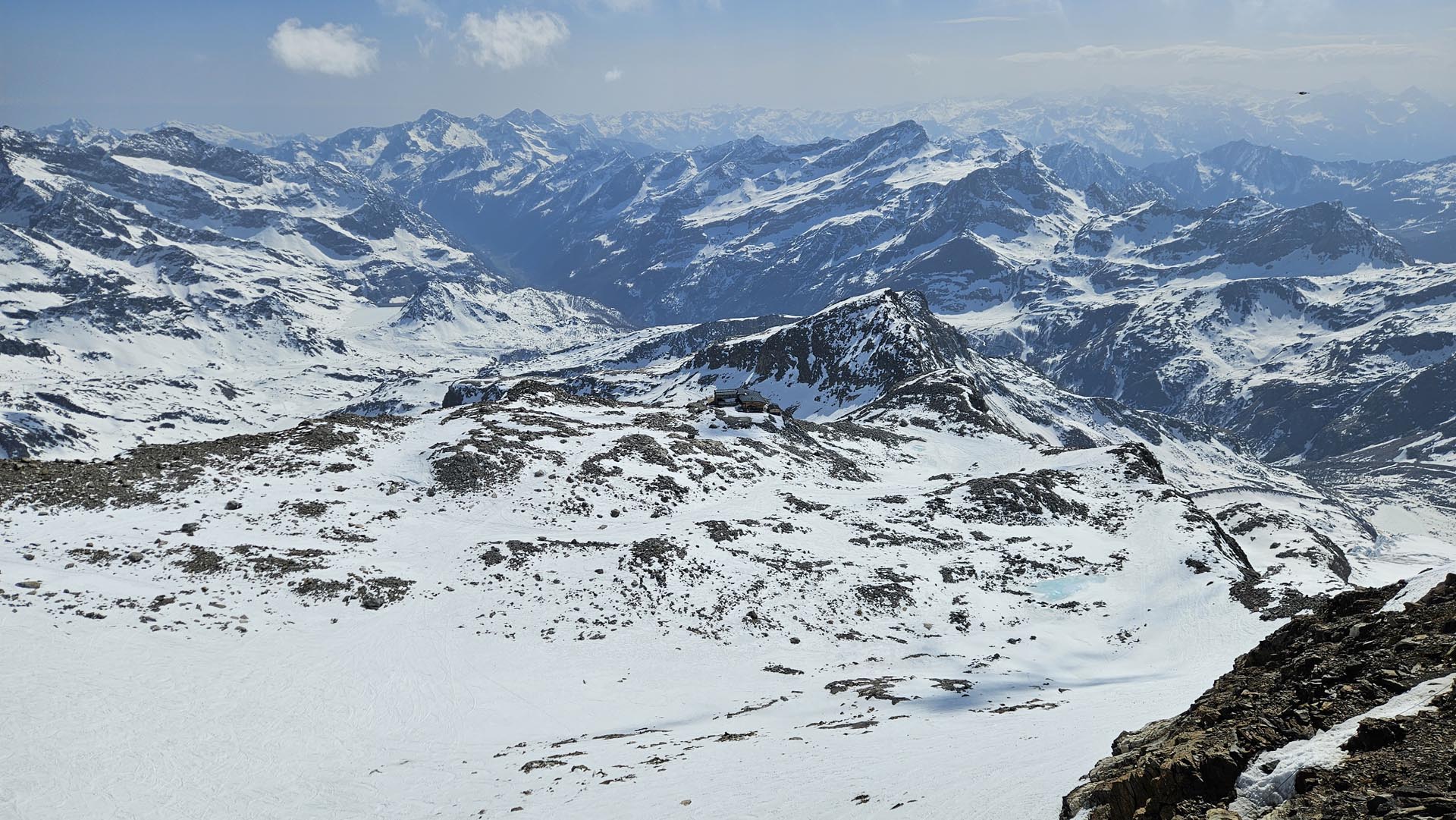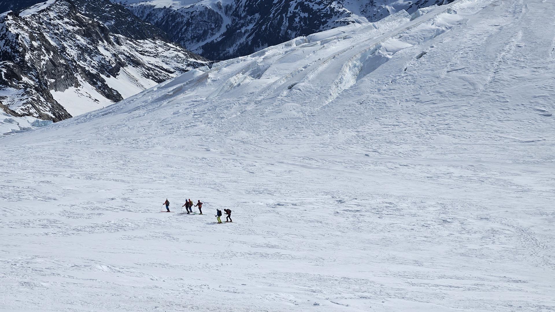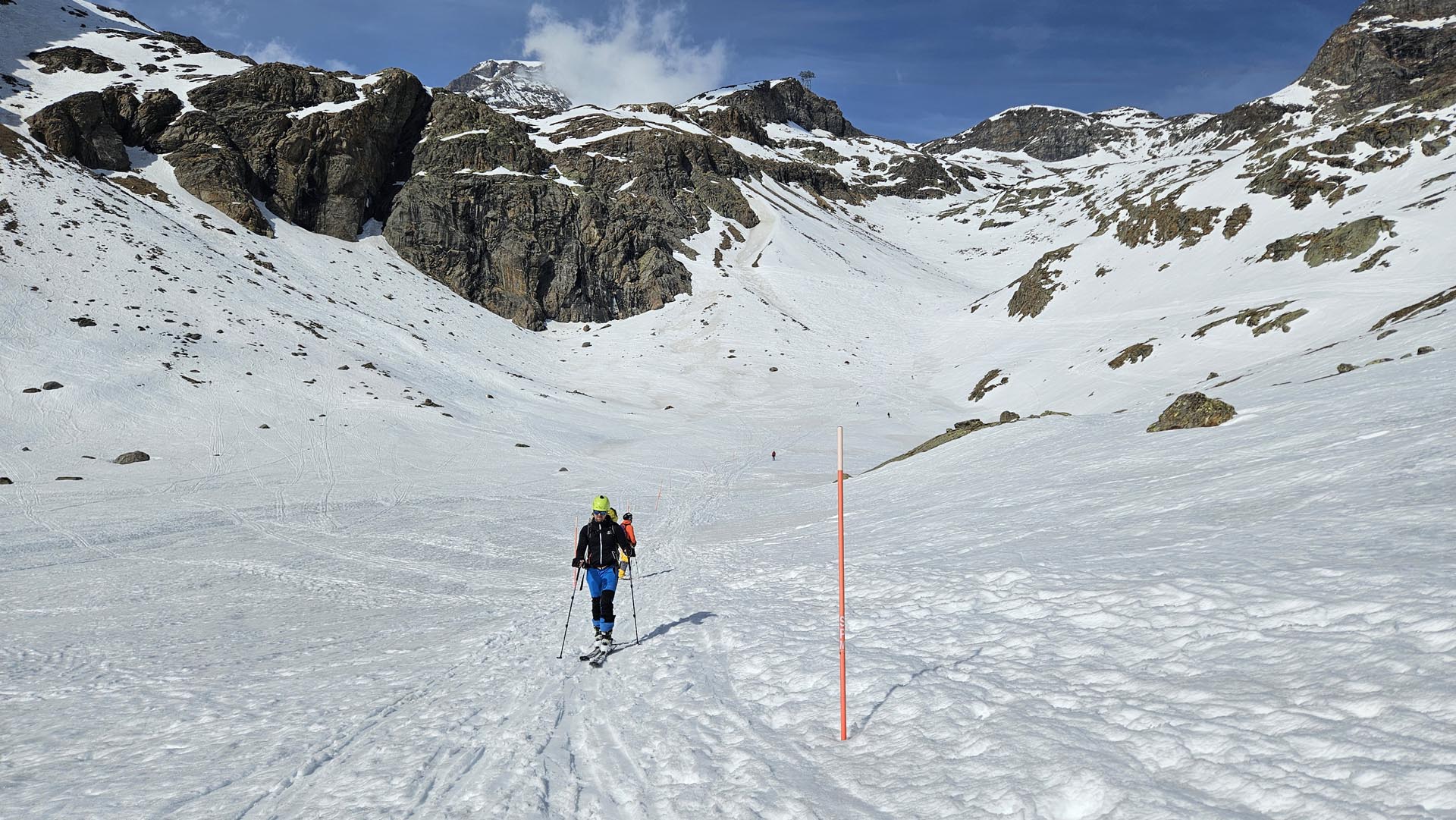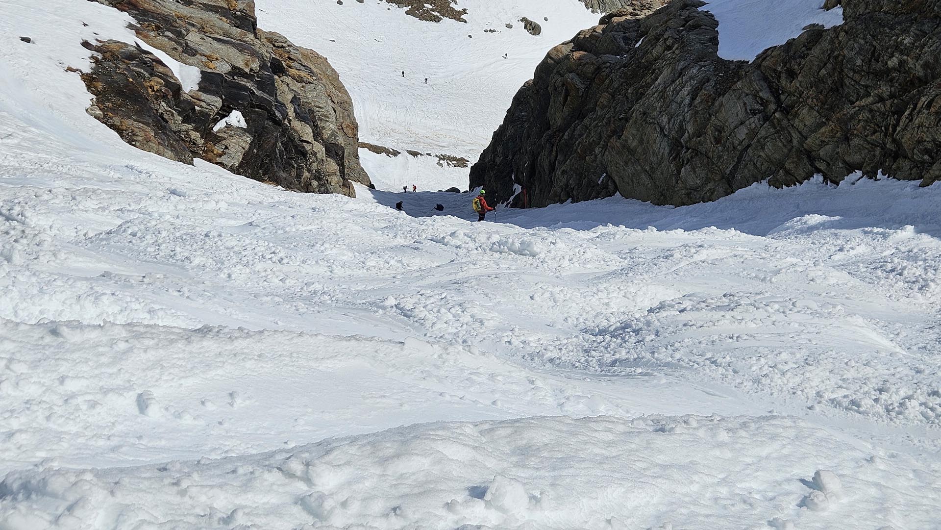 Po vrnitvi na kočo Gnifetti in krajšem počitku sva se z Alešem odločila za takojšnjo vrnitev v dolino. Več kot 1800 m spusta je bil kljub utrujenosti lepši del smučarije tega dneva, saj je sneg v pretežnem delu spusta odmrznil le toliko, da se smuči pod njim niso preveč ugrezale in so dovolj ubogale upravljalca tudi na nekaj mestih, ki so bili precej pokončni. Je pa zadnjih petsto metro, po smučišču, že pošteno cukalo. Naslednje jutro se je pooblačilo in kolegi niso imeli te sreče, zato so se namučili s spustom, ki sta ga poleg pomrznjene in razrite podlage dodatno začinila še difuzna svetloba ter v delu spodnje polovice poti še megla.