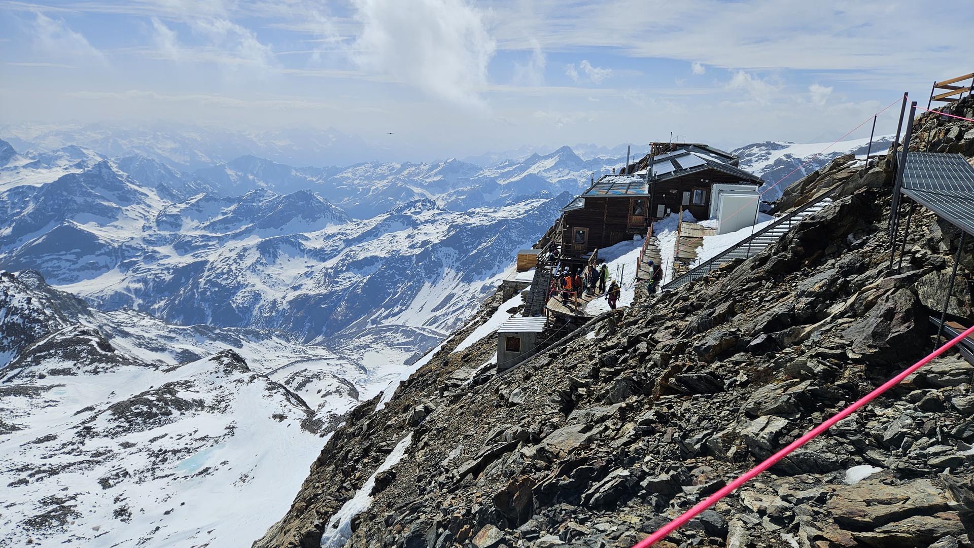 Po krajšem spustu s sedla je sledil še zadnji malo strmejši kos poti do našega cilja, do koče Margherita, ki so jo zgradili prav na konici 4554 m visokega vršaca in je najvišja koča v Alpah. Prvo kočo so zgradili že konec 19. stoletja, zadnja temeljita obnova pa je bila l. 1980. V njej je vremenska postaja in raziskovalni laboratorij, pa verjetno še kaj (… vojaškega?).