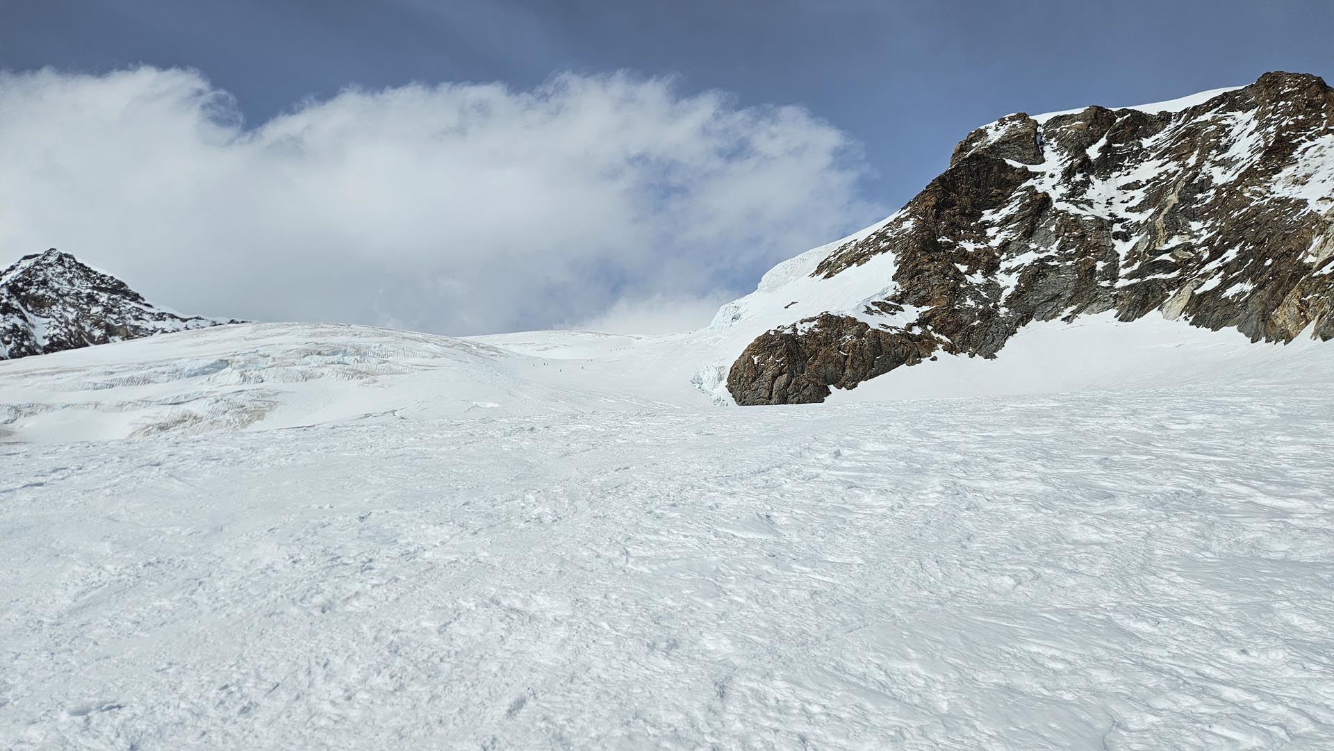 Do sedla Lys (4246 m), kjer smo formalno vstopili v Švico, je bila strmina še naprej enakomerna in zložna, hoja pa bi bila celo udobna, če se telo ne bi moralo boriti z vedno novim primanjkljajem kisika. Tempo napredovanja je zaradi tega upadal, a je bilo misli v glavi bolje usmerjati v enkratne poglede na ožji ambient in panoramo ter vrhove vključno z najvišjimi tam okoli (Lyskamm) in najbolj atraktivnimi (Matterhorn).